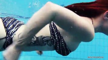 Redheaded Katrin is stripping underwater